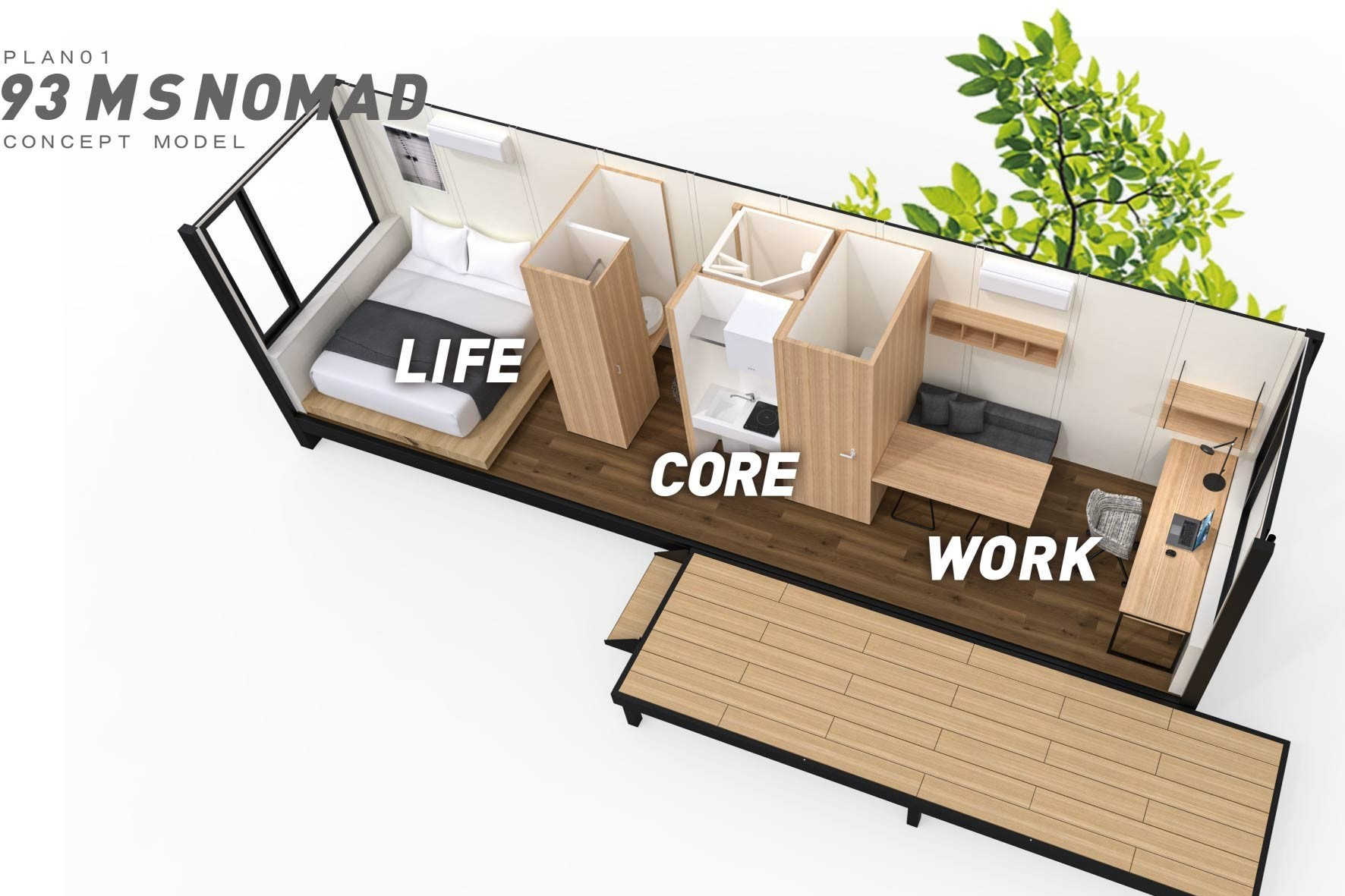 コロナ禍でライフスタイルが多様化する中、場所や時間にとらわれない新しい働き方・住まい方を実現するためMS NOMADは開発されました。本製品は、設置・移設が容易なユニットハウスと家具のようにユニット化した水まわりを組み合わせ、自宅の庭先から、駅前・高架下、郊外、更には大自然といったあらゆるシーンでノマド的生活を提供する空間プロダクトシリーズです。